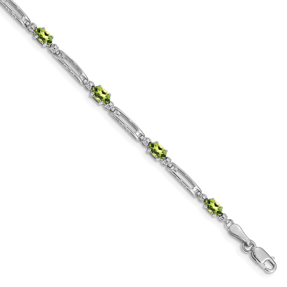 Material: Primary - Purity:10K *| - |* Finish:Polished *| - |* Stone Type_1:Peridot *| - |* Stone Type_2:Diamond *| - |* Stone Color_1:Green *| - |* Stone Quantity_1:8 *| - |* Stone Quantity_2:1 *| - |* Length of Item:7 in *| - |* Plating:Rhodium *| - |* Stone Weight_1:0.25 ct *| - |* Stone Weight_2:0.005 ct *| - |* Chain Length:7 in *| - |* Chain Width:3.5 mm *| - |* Clasp /Connector:Lobster *| - |* Material: Primary:Gold *| - |* Completeness:Complete (all stones included) *| - |* Stone Shape_1:Oval *| - |* Stone Shape_2:Round *| - |* Stone Size_1:5 x 3 mm *| - |* Stone Size_2:1 mm *| - |* Stone Treatment_1:Not Enhanced *| - |* Width of Item:3.5 mm *| - |* Product Type:Jewelry *| - |* Jewelry Type:Bracelets *| - |* Sold By Unit:Each *| - |* Bracelet Type:Gemstones *| - |* Gender:Women's *| - |* Material: Primary - Color:White *| - |* Stone Creation Method_1:Natural *| - |* Stone Creation Method_2:Natural