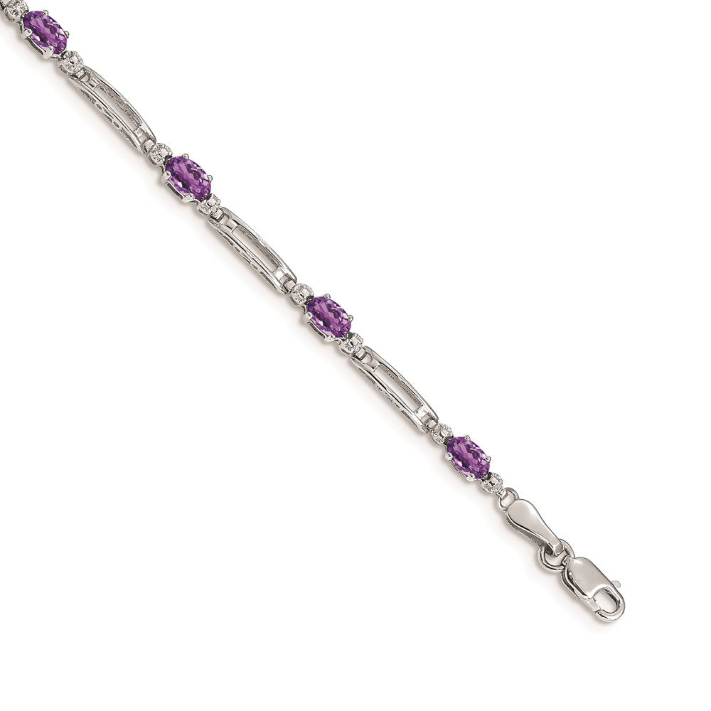 Material: Primary - Purity:14K *| - |* Finish:Polished *| - |* Stone Type_1:Amethyst *| - |* Stone Type_2:Diamond *| - |* Stone Color_1:Purple *| - |* Stone Quantity_1:8 *| - |* Stone Quantity_2:1 *| - |* Length of Item:7 in *| - |* Plating:Rhodium *| - |* Stone Weight_1:0.23 ct *| - |* Stone Weight_2:0.005 ct *| - |* Chain Length:7 in *| - |* Chain Width:3.5 mm *| - |* Clasp /Connector:Lobster *| - |* Material: Primary:Gold *| - |* Completeness:Complete (all stones included) *| - |* Stone Shape_1:Oval *| - |* Stone Shape_2:Round *| - |* Stone Size_1:5 x 3 mm *| - |* Stone Size_2:1 mm *| - |* Stone Treatment_1:Heating *| - |* Width of Item:3.5 mm *| - |* Product Type:Jewelry *| - |* Jewelry Type:Bracelets *| - |* Sold By Unit:Each *| - |* Bracelet Type:Gemstones *| - |* Material: Primary - Color:White *| - |* Stone Creation Method_1:Natural *| - |* Stone Creation Method_2:Natural